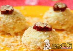 7、团子放入蛋糕末里,小心翻滚使其表面均匀裹上蛋糕末。最后装盘,点缀上切成片状的红枣片就可以了。