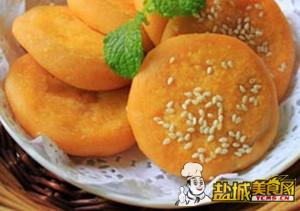 5、把面团分成10个大小一样的面团挤子,每个挤子压扁,包入一大勺香芋馅,再次压扁。