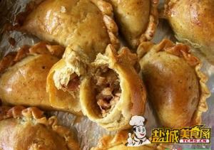 8、将醒好的面团擀成约0.4CM厚的薄片,放上馅料,包成油角形状,摆入铺好油纸或锡纸的烤盘中,刷一层蛋黄液,放进205度预热的烤箱中,烤21分钟。