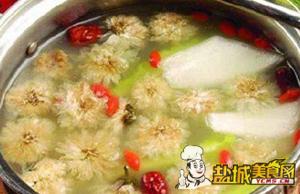 3、捞取鱼骨,把汤舀入火锅内,作为锅底加入菊花煮沸约两分钟