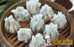 4.将面粉倒案板或缸内,中间扒窝,加沸水250克,搓揉成雪花状,让热气稍散,再加冷水175克拌和搋揉成面团。在案板上将面团搓成长条,摘成大小相等的面剂100只,逐个拍扁,用面杖擀成直径约12厘米的圆形面皮(中间稍厚、边缘较薄)。将馅心(约45克)刮入皮中心,用右手稍带起边皮立即合拢,在虎口处稍捏紧,使馅心微露口外,皮边交错折压,似裙褶状。