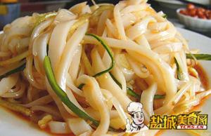 7.凉拌,凉皮切宽条,面筋切块,加盐、醋、香油、蒜泥、生抽、油辣子,还可以根据自己口味加入黄瓜、豆芽等蔬菜,搅拌均匀即可食用!