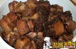 ②锅中放适量清水,放入肉块,加酱油、绍酒、桂皮、茴香,加盖用大火煮至八成熟,下红曲米、糖和干菜,翻拌均匀,煮约5分钟,以吸干肉汁为度,然后加味精起锅。