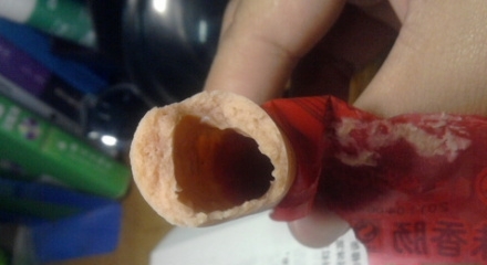 今天上午,@大旗网发微薄:现在火腿肠都开始玩空心了么……微博正文中还有一张图片,照片上,是一根被去除了一半包装的火腿肠,而火腿肠中间一个大大的空心洞十分显眼。